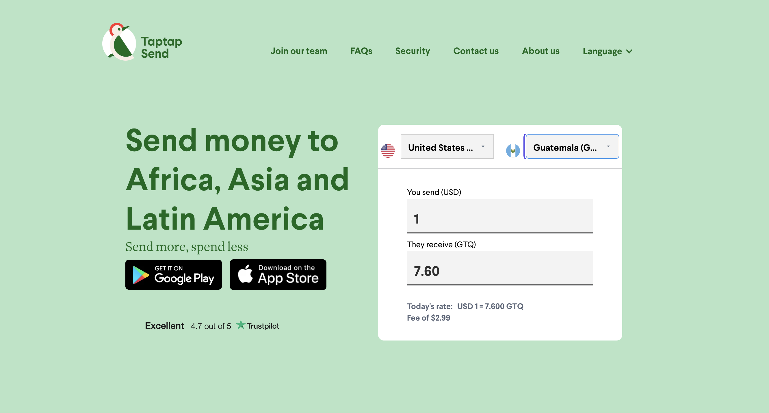 Founded to serve corridors that are often underserved or overcharged by legacy players, Taptap Send has grown to more than 100,000 customers and earned a 4.7-star rating on Trustpilot from over 31,000 reviews. Their Guatemala corridor is one of their strongest — offering direct bank deposits, cash pickup, and highly competitive quetzal exchange rates.